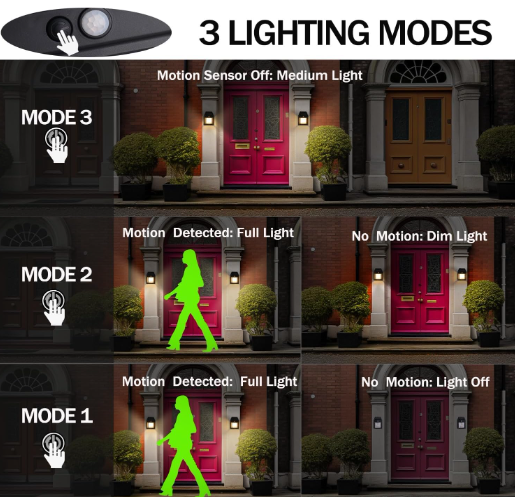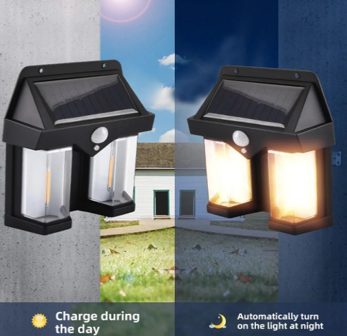 Energie solara si comutator automat: lampa solara de perete foloseste panouri solare din siliciu policristalin de ultima generatie, cu capacitate mare de stocare si rata de conversie mare, care sunt echipate cu senzori fotoelectrici care se aprind automat la amurg si se sting în zori.