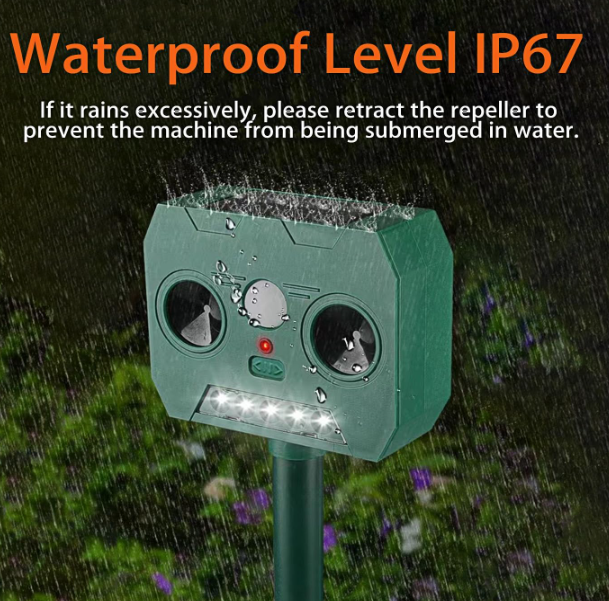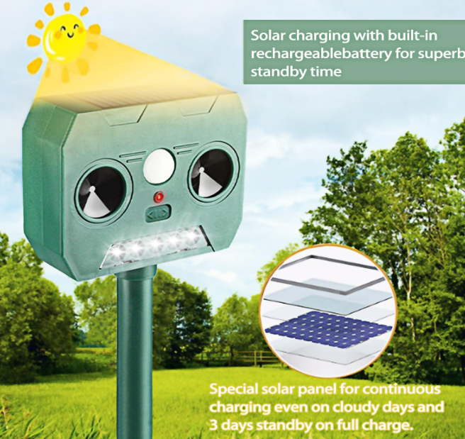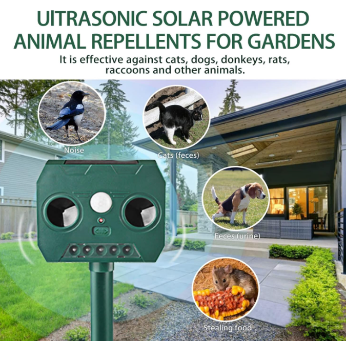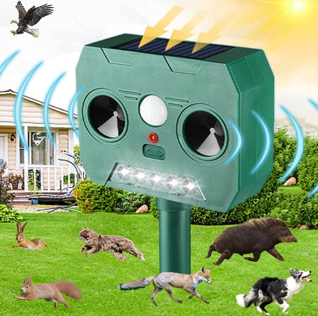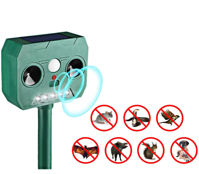 Dispozitiv pentru alungat animalele nedorite, pisici, catei, veverite, iepuri, soareci, ratoni, chiar si caprioare. Alungati daunatorii din curtea, gradina sau livada dumneavoastra intr-un mod ecologic, fara substante toxice. Aparatul functioneaza cu alimentare solara. Aparatul Solar Animal Repeller cu ultrasunete este ideal impotriva pisicilor, cateilor, veveritelor, iepurilor, soarecilor, ratonilor, chiar si caprioare, cat si alte animale nedorite in curtea dumneavoastra.