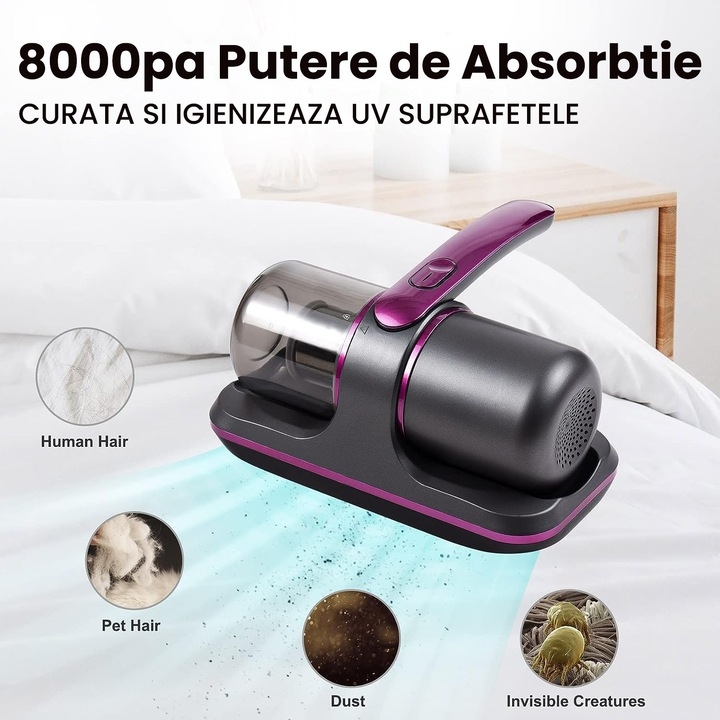 Aspirator antiacarieni 2 in 1 cu tehnologie UV-C, ideal pentru curatarea profunda a saltelelor si textilelor. Compact, fara fir si eficient impotriva alergenilor.