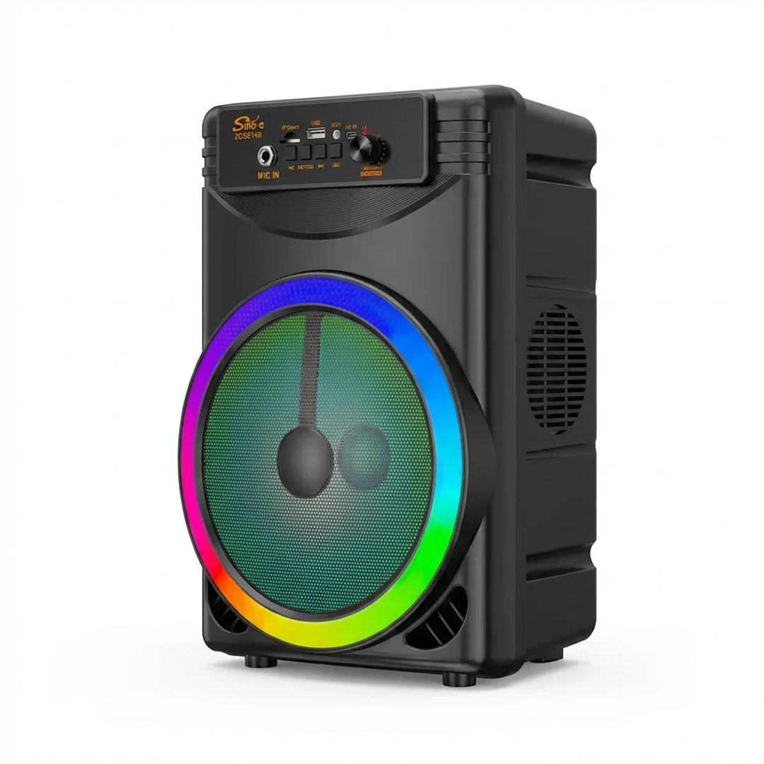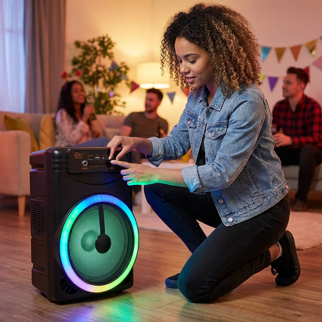 Boxa portabilă Bluetooth cu difuzor de 8 inch este ideală pentru petreceri, activități outdoor și evenimente. Oferă sunet clar cu bass puternic, iluminare RGB dinamică și conectivitate multiplă, fiind ușor de transportat datorită mânerului integrat și designului robust, rezistent la stropire.