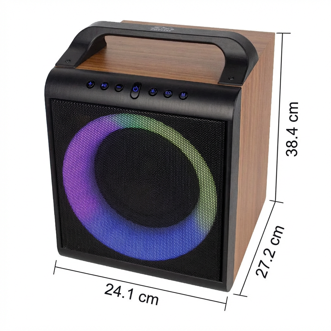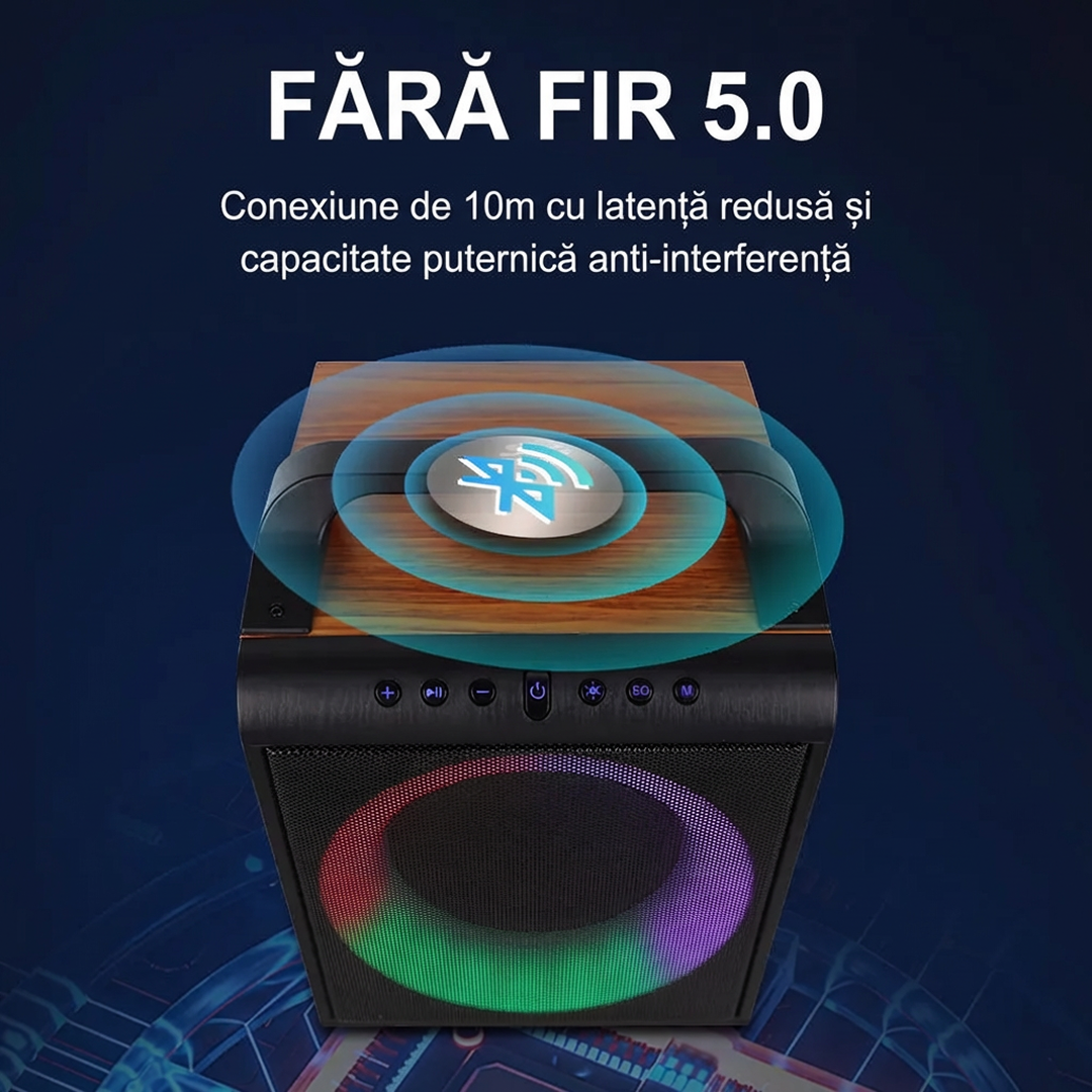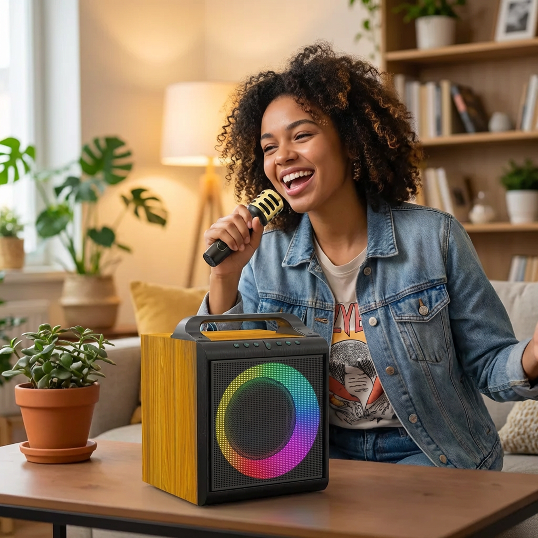 Boxa portabilă Sing-e este alegerea ideală pentru petreceri, karaoke și divertisment atât acasă, cât și în aer liber. Echipată cu difuzor de 6 inch cu incintă din lemn, baterie de mare capacitate și iluminare RGB dinamică, oferă un sunet puternic și o atmosferă vibrantă oriunde o folosești.