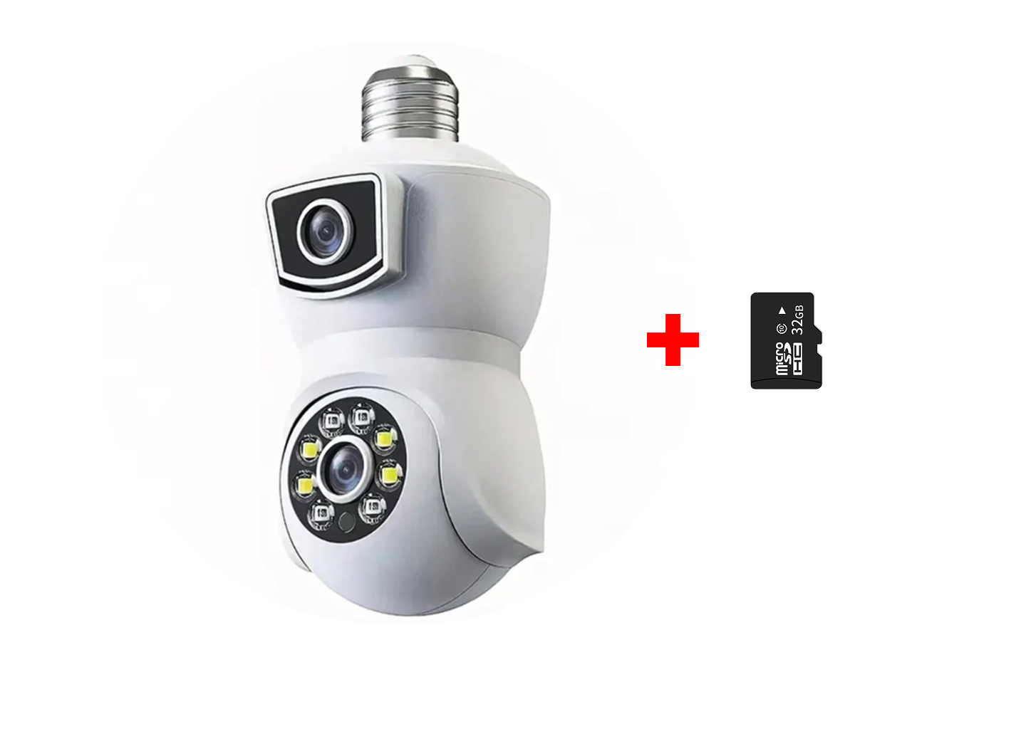 Camera de supraveghere dubla tip bec, 2MP, 360° panoramic, 1080P, detectare a miscarii, alarma, vedere nocturna, PTZ, WiFi + Card Memorie 32gb CADOU