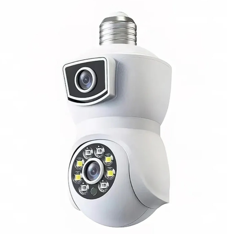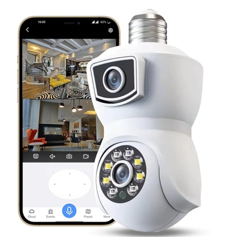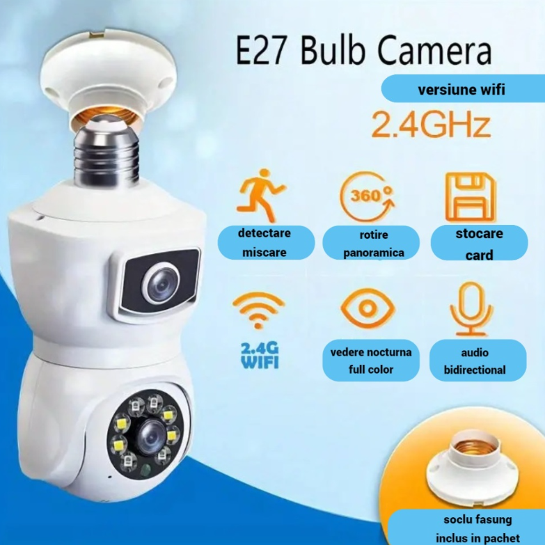Transformă orice soclu de bec într-un sistem de securitate inteligent cu această cameră Wi-Fi 1080P tip bec, cu lentilă dublă și rotire PTZ 360°, vedere nocturnă color, detecție mișcare, alarmă acustică și audio bidirecțional. Se instalează în 10 secunde și vine cu card 32GB CADOU!