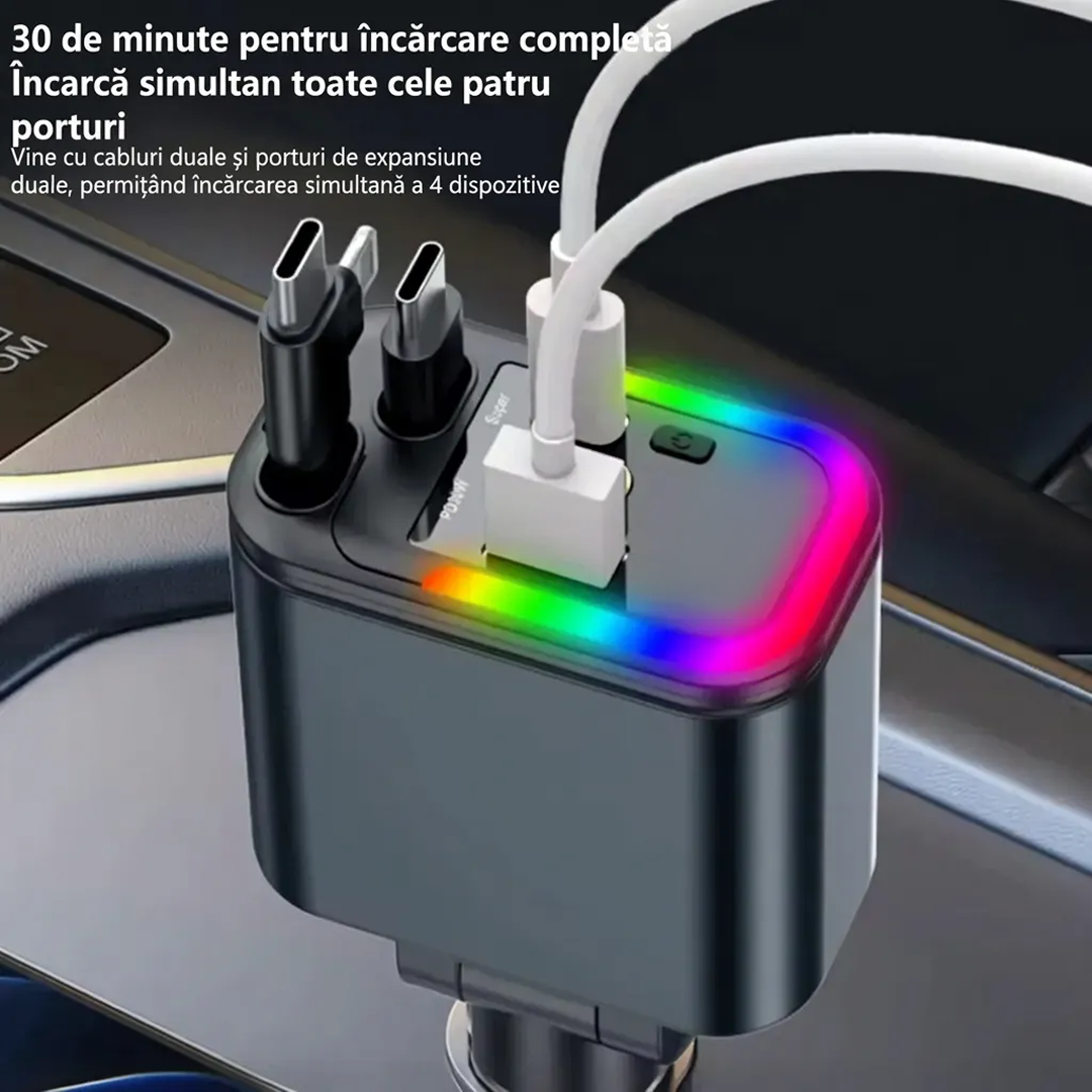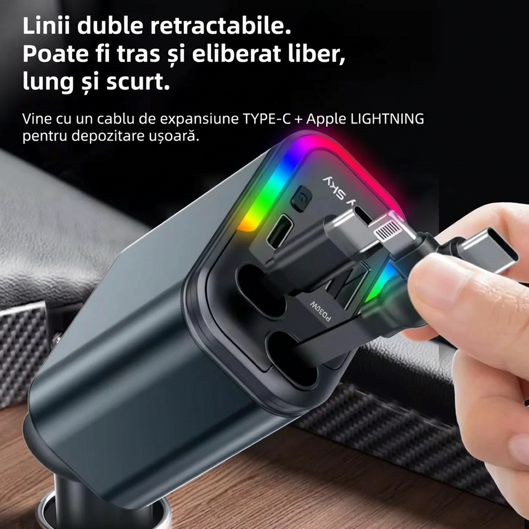 Incarcatorul auto 5 in 1 de 120W permite alimentarea rapida a mai multor dispozitive simultan, fiind echipat cu cabluri retractabile Lightning, USB-C si Micro USB, precum si porturi USB suplimentare. Designul cu rotire 180° ofera flexibilitate si adaptare usoara in orice tip de masina. Iluminarea LED ambient tip „starry sky” adauga un aspect modern interiorului auto. Este compatibil cu majoritatea smartphone-urilor, tabletelor si dispozitivelor GPS.
