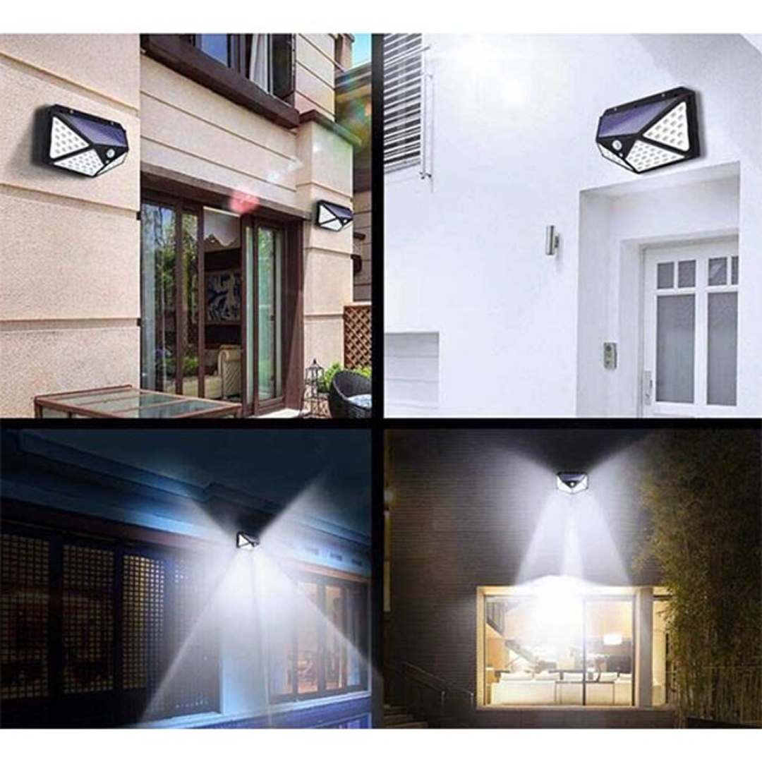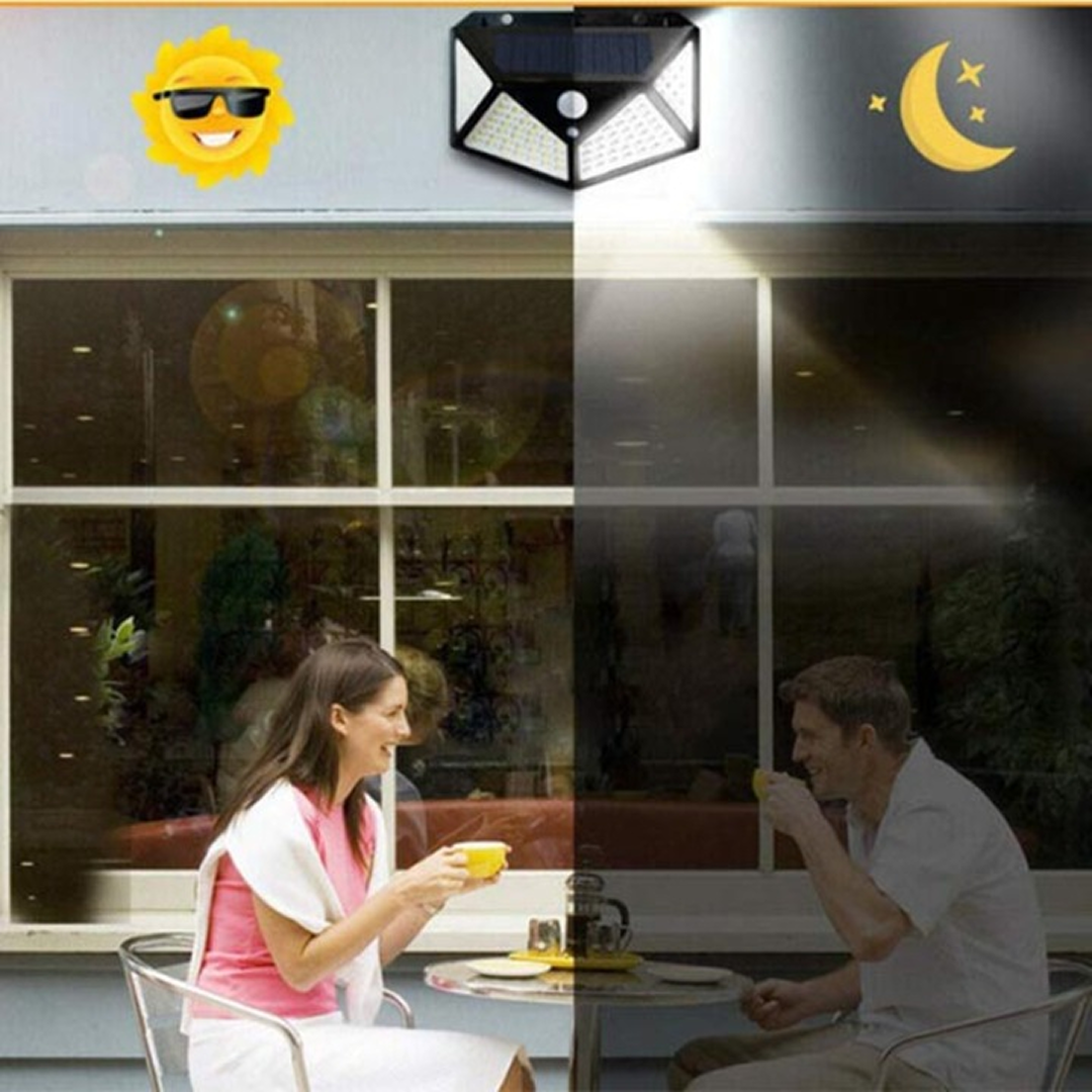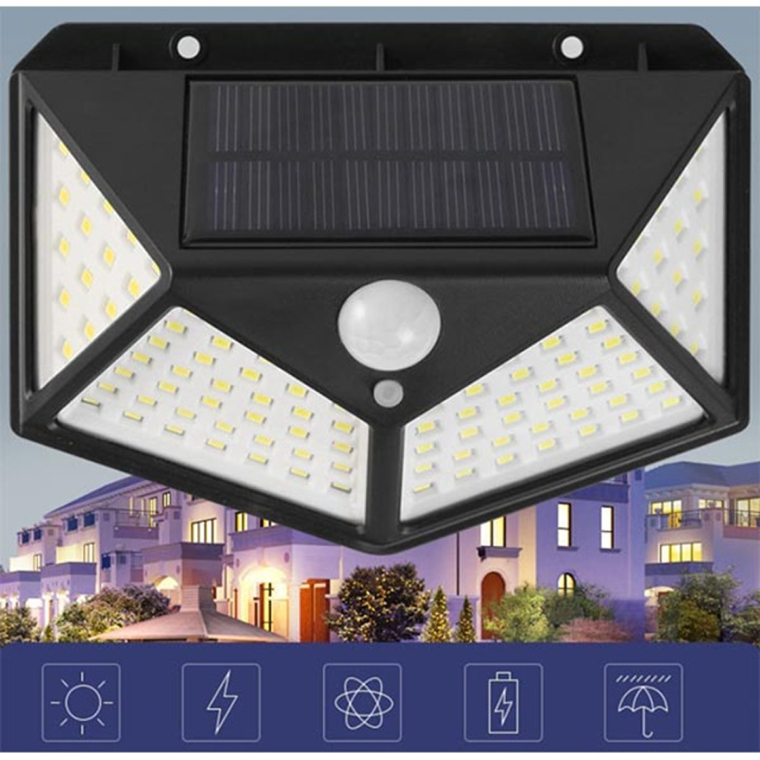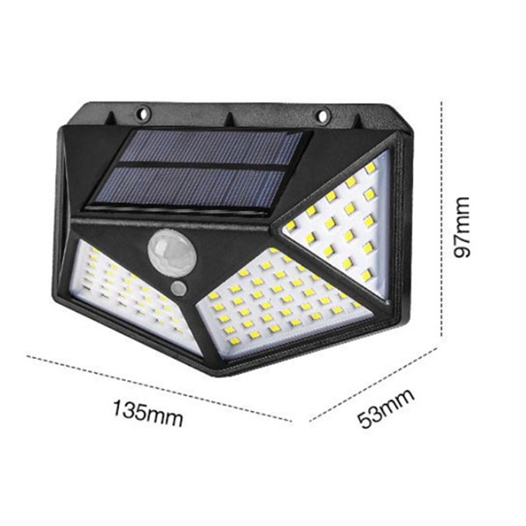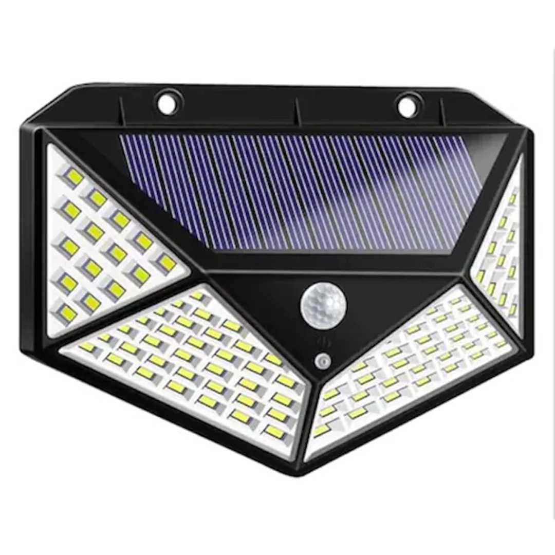 Lampa solara LED cu 100 LED-uri si senzor de miscare, ideala pentru iluminare automata si eficienta in exterior. Functioneaza 100% pe energie solara, fara costuri la curent si fara cabluri.