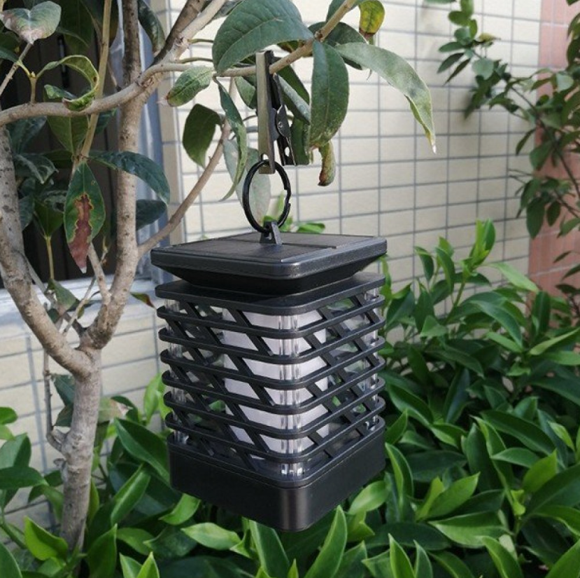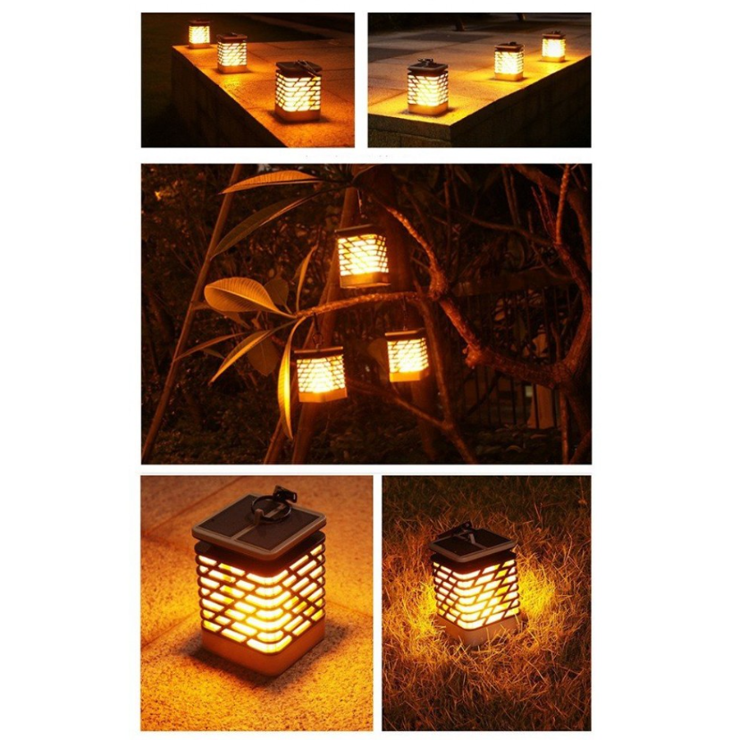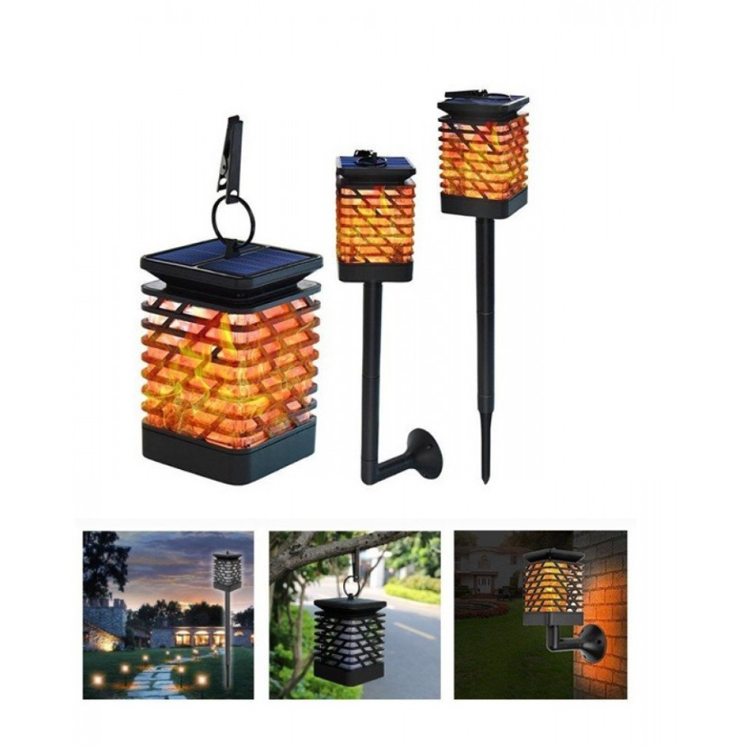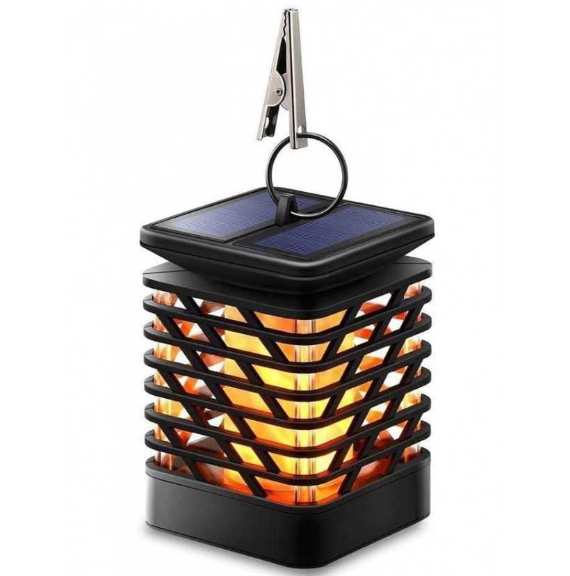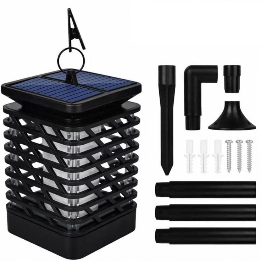 Lampa solara LED cu efect flacara, tip felinar, de exterior, gradina, terasa, cu suport si carlig de agatare, IP44