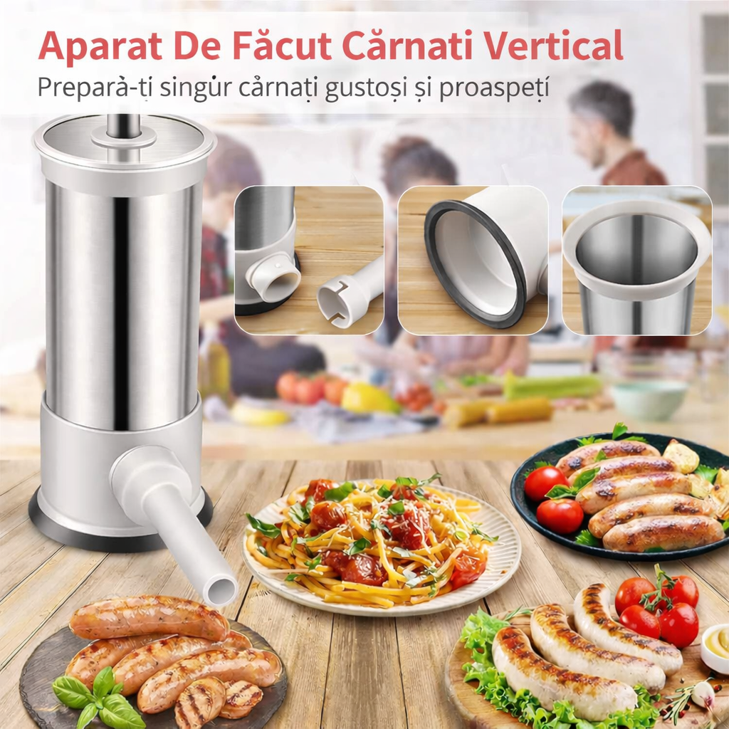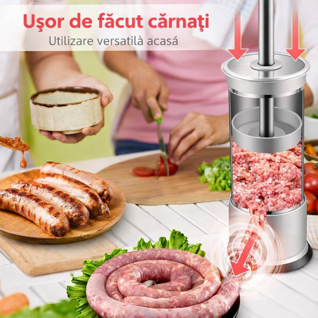 Set complet pentru umplerea cârnaților de casă, compus dintr-o mașină de umplut și patru tuburi de dimensiuni diferite. Conceput pentru utilizare ușoară, stabilitate bună și control asupra ingredientelor, este potrivit pentru preparate tradiționale realizate acasă.