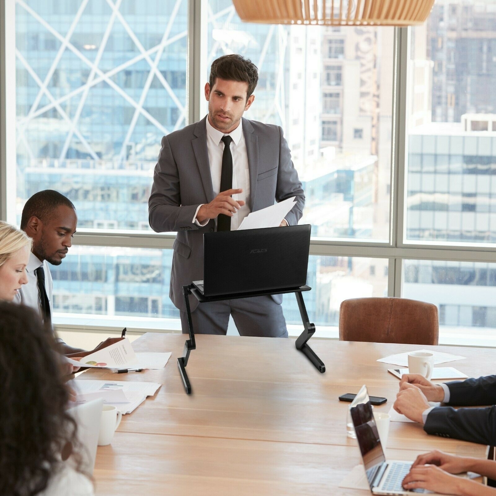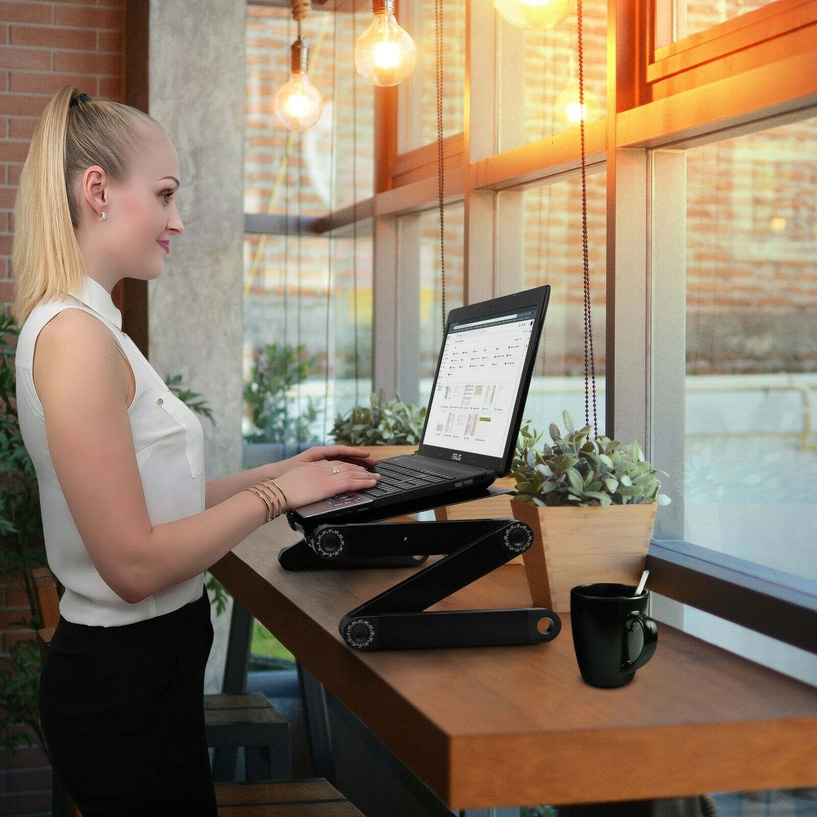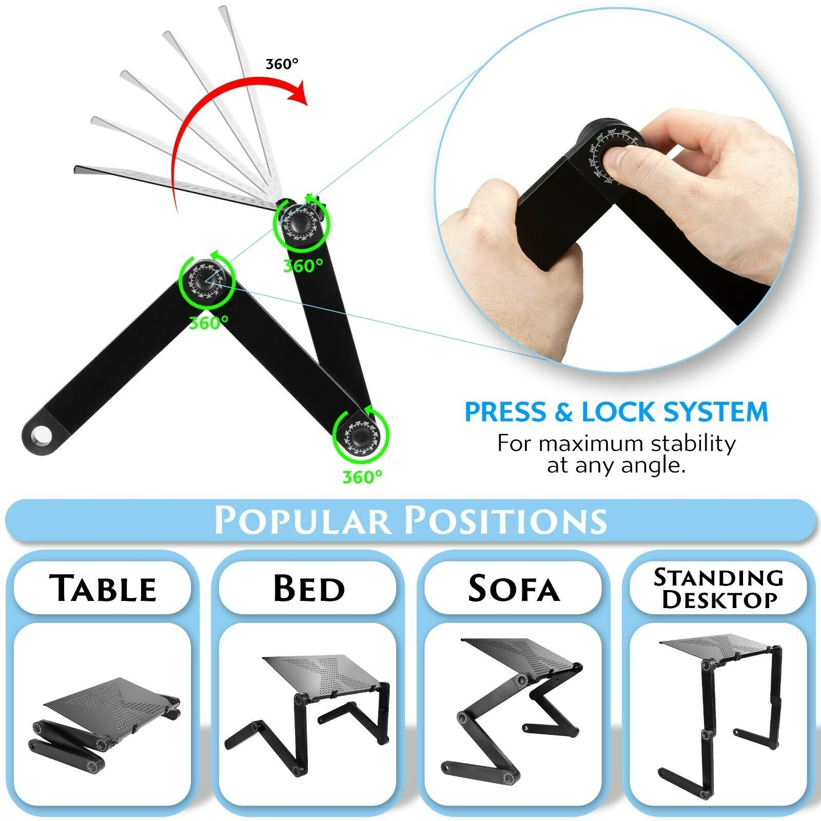 Masuta multifunctionala portabila se poate regla in diferite pozitii si unghiuri de inclinatie printr-o simpla apasare de buton si va ofera flexibilitate in utilizarea laptopului, confort si protejarea sanatatii dvs. prin adoptarea unei posturi corecte (va protejati coloana vertebrala, incheieturile mainilor, ochii, zonele moi etc.) indiferent de locul in care folositi laptopul – in pat, pe canapea, fotoliu, scaun, pe jos, pe birou etc.