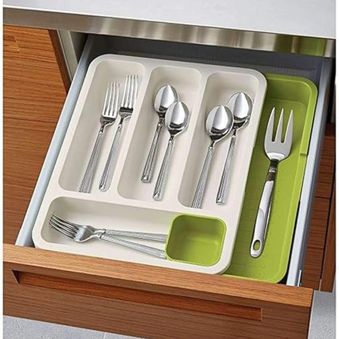 Organizator extensibil pentru sertar, ideal pentru pastrarea tacamurilor ordonate si la indemana. Design ajustabil si compartimente adanci pentru organizare eficienta in orice bucatarie.