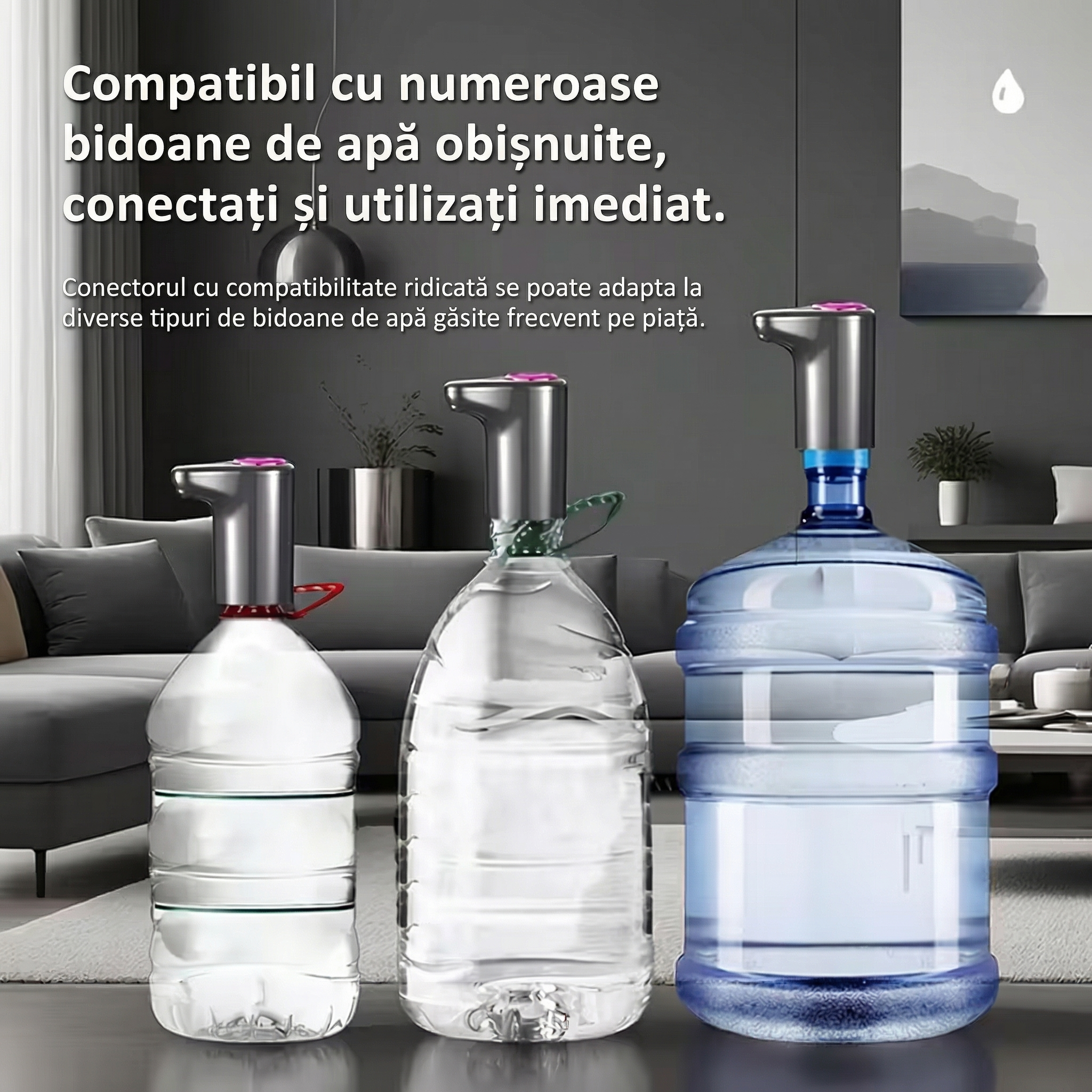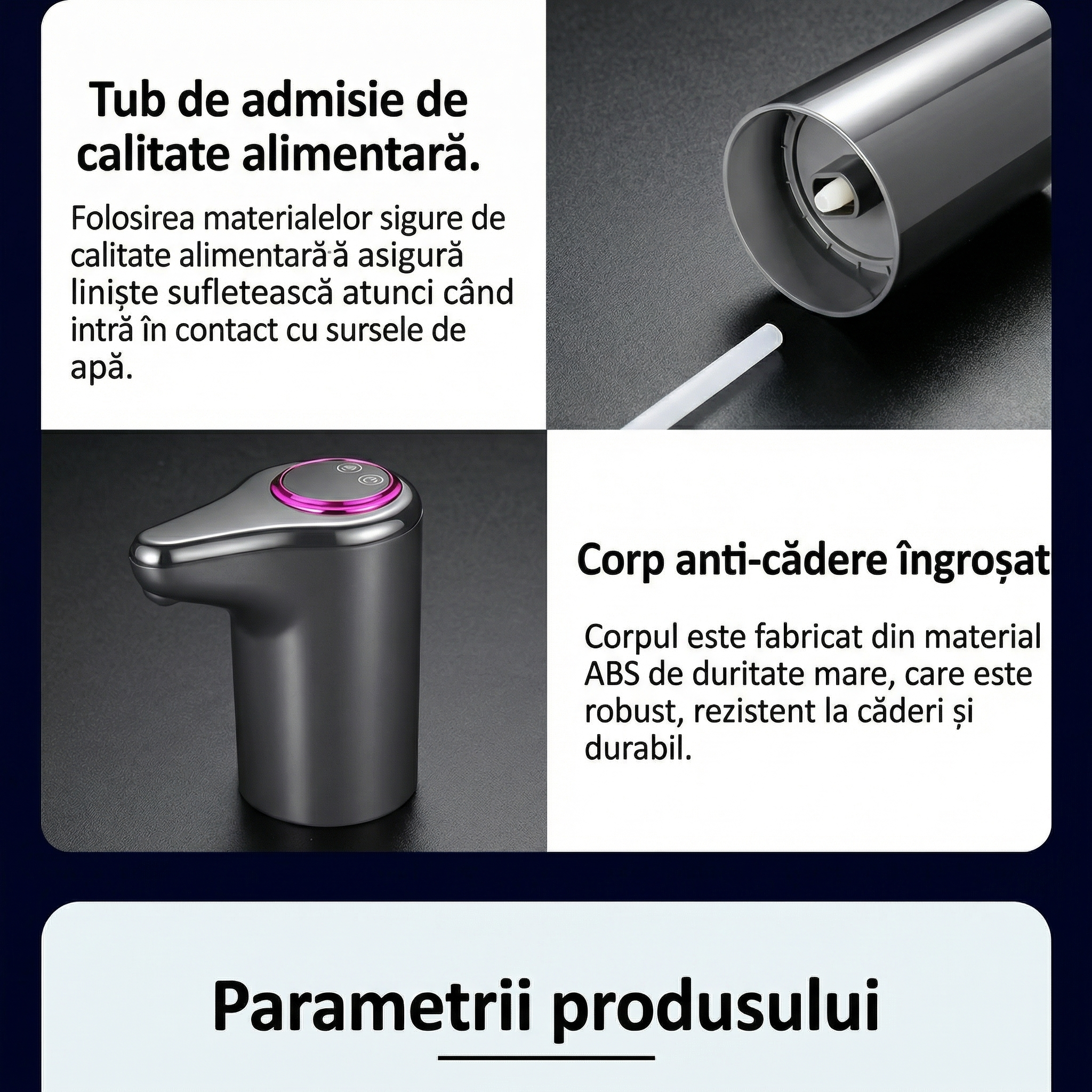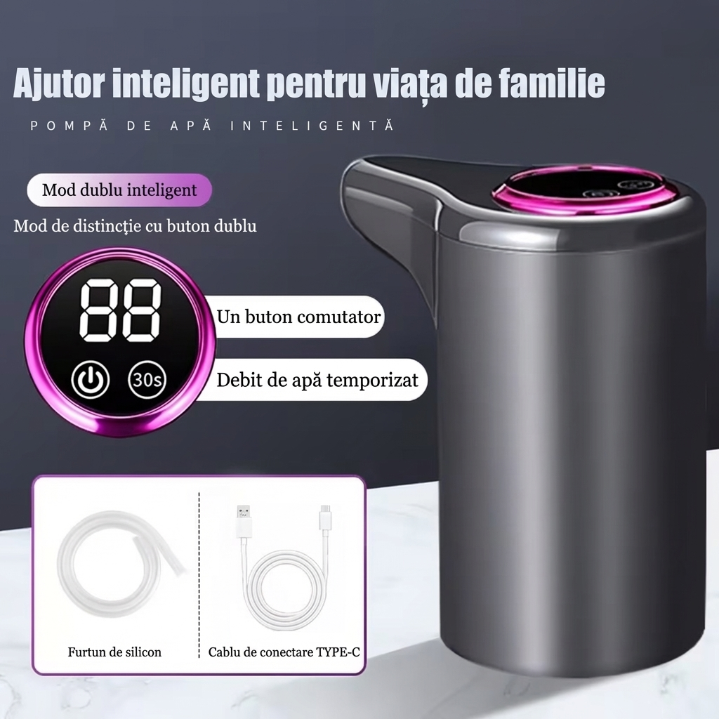 Pompa electrica pentru apa cu display LCD si incarcare USB-C, ideala pentru dozare rapida si igienica. Compacta si portabila, perfecta pentru acasa sau calatorii.