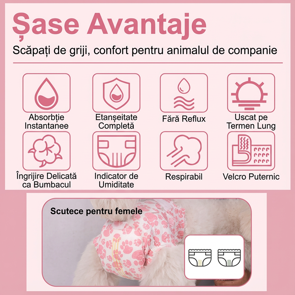 Scutecele de unica folosinta pentru caini femele, marimea M (30–50 cm), sunt concepute pentru a oferi protectie sigura si confortabila cainilor de talie mica spre medie. Sunt ideale pentru perioadele de calduri, incontinenta sau educare igienica, mentinand locuinta curata si animalul uscat.