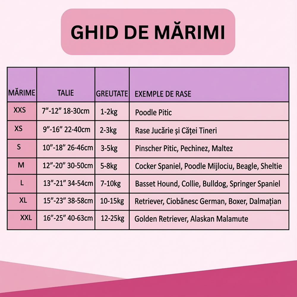 Pentru pui si caini femele de talie foarte mica, cu circumferinta taliei intre 22 si 40 cm.