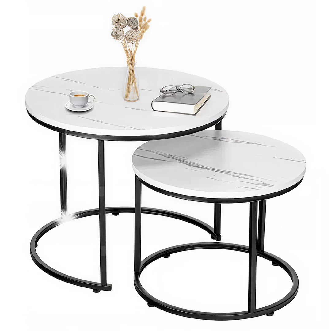 Setul de mese rotunde pentru living este compus din doua piese cu design modern in stil loft, finisaj negru marmura si cadru metalic solid. Mesele pot fi folosite impreuna, separat sau suprapuse pentru economisirea spatiului. Constructia stabila si sarcina maxima de 30 kg pentru fiecare masa le fac potrivite pentru utilizare zilnica. Sunt ideale pentru livinguri moderne, spatii compacte sau amenajari industriale.