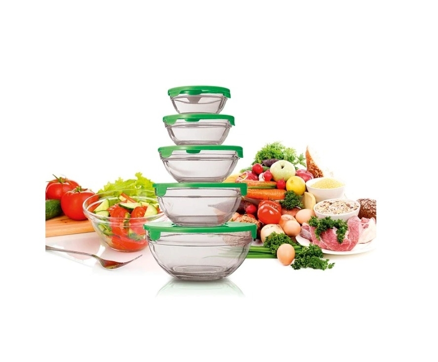 Setul de 5 boluri sticla cu capace este format din 5 boluri din sticla speciala, rezistenta la temperaturi intre -20 si +120 grade, avand capacitati si dimensiuni diferite.