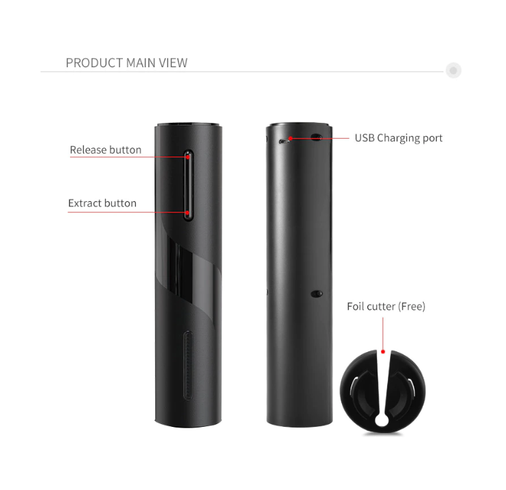- Tirbușonul este extrem de ușor de folosit datorită celor 2 butoane. Acesta este însoțit și de un tăietor de capison sau foil cutter.