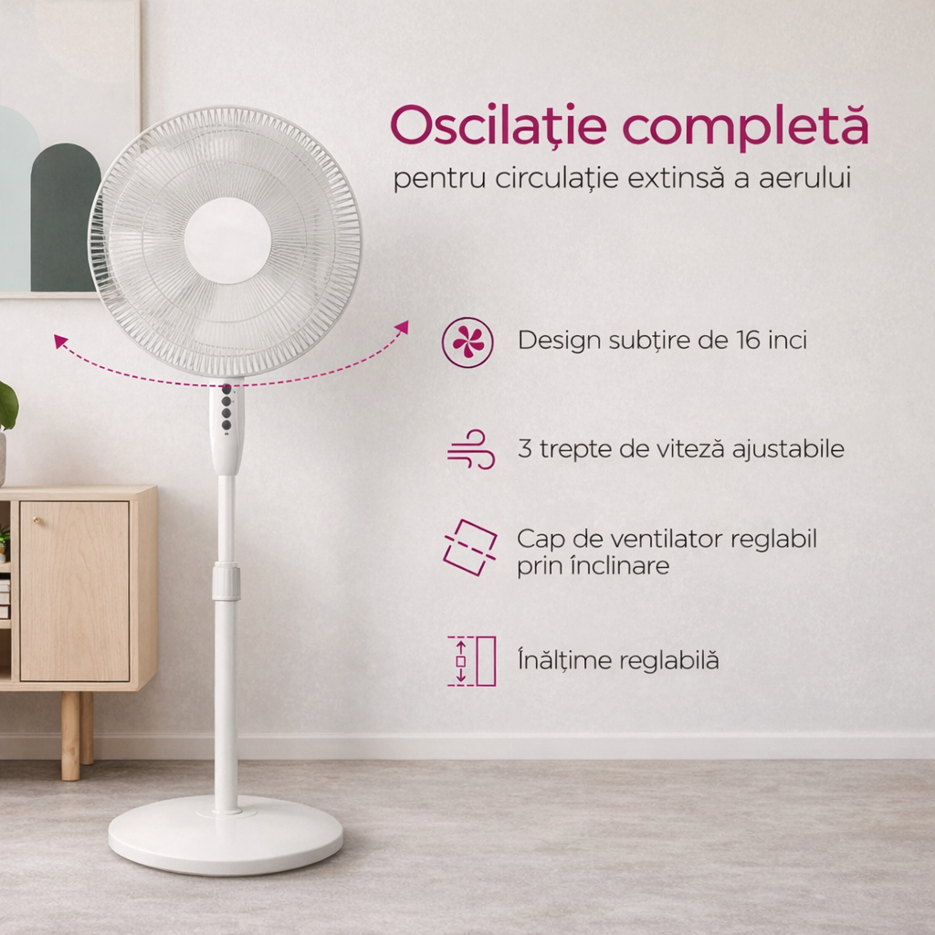 Ventilator cu picior de 16 inch, puternic si eficient, ideal pentru racorirea rapida a incaperilor. Dotat cu 3 viteze, oscilatie si timer, ofera confort si control complet.